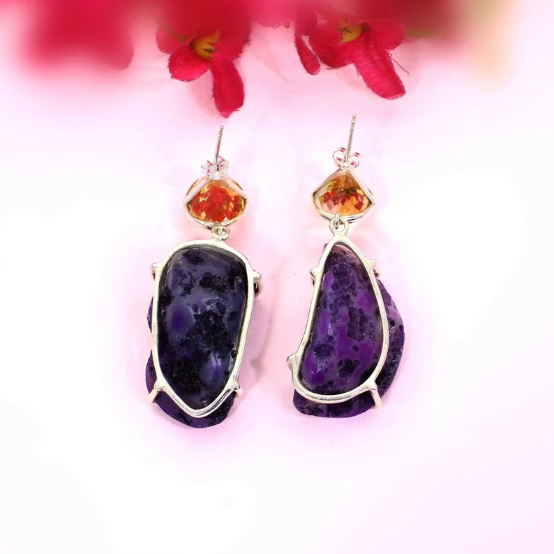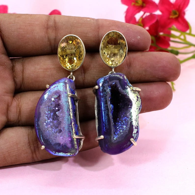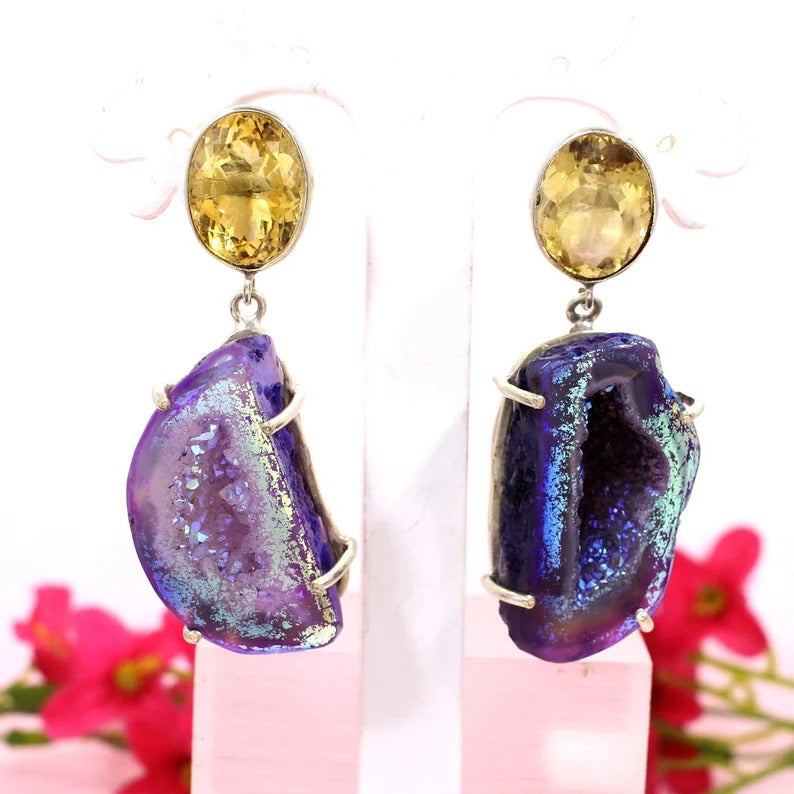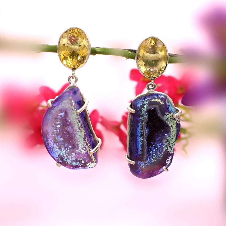 92.5 Sterling Silver Titanium Druzy Earrings & Yellow Citrine Earrings