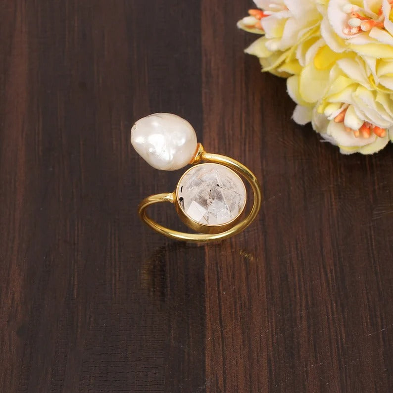 Black rutile And Pearl Gemstone Brass Ring