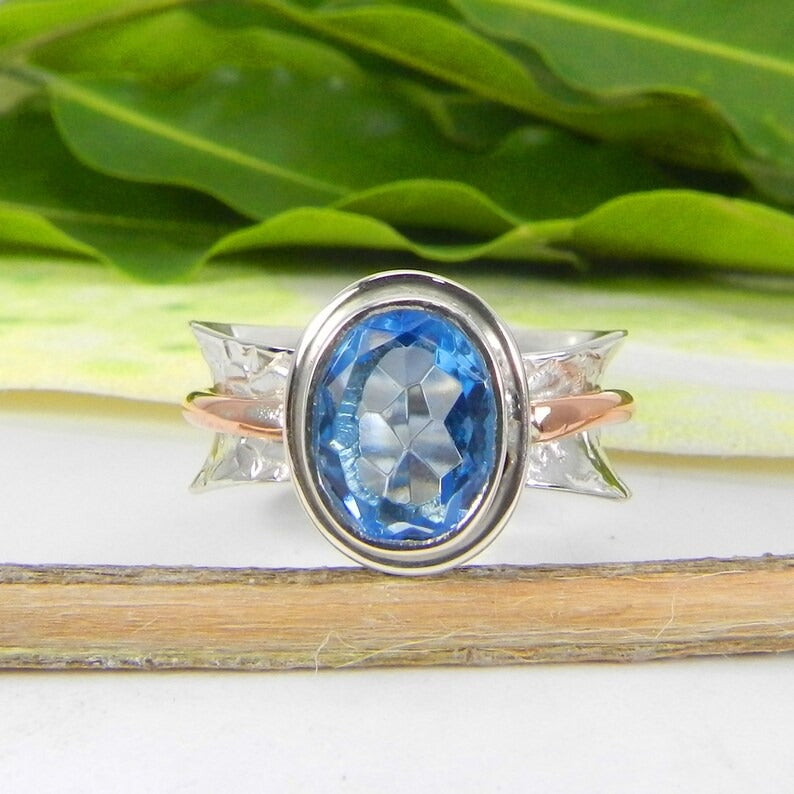 Blue Topaz 925 Sterling Silver Designer Textured Two-Tone Plating Ring