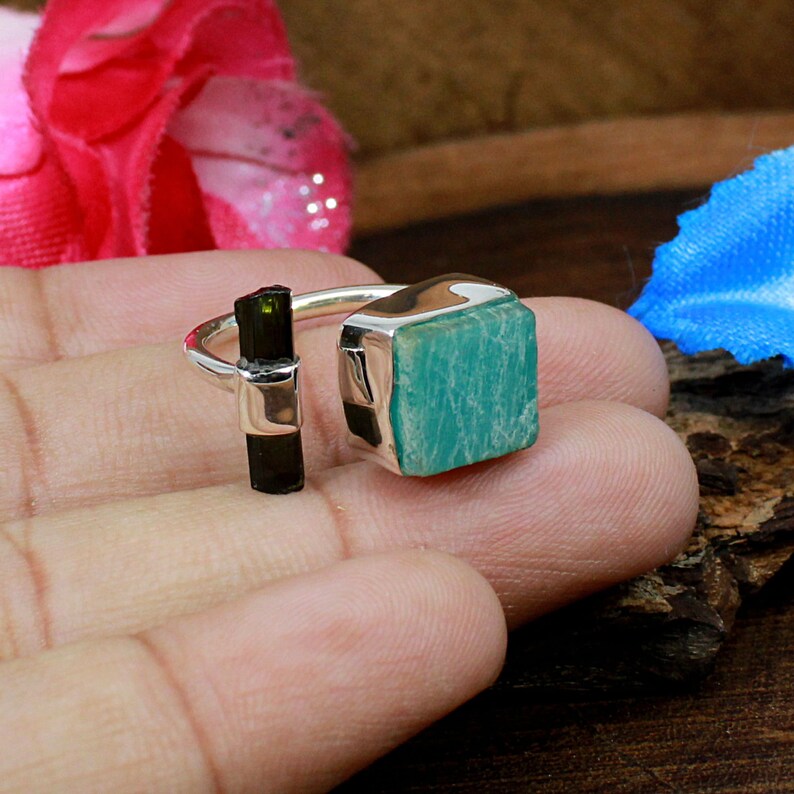 Natural Amazonite & Green Tourmaline Gemstone 92.5 Sterling Silver Ring