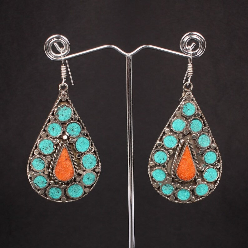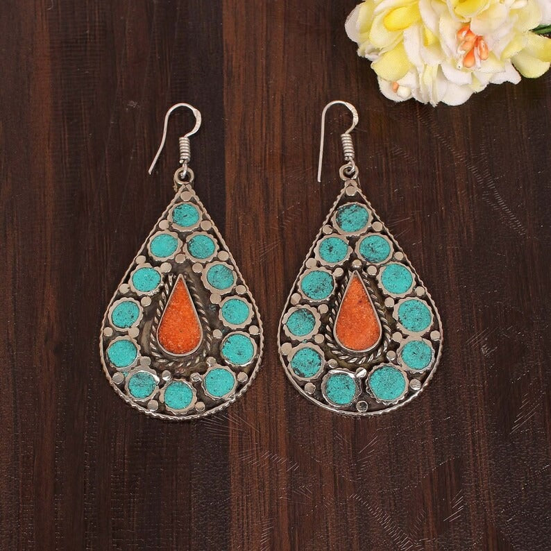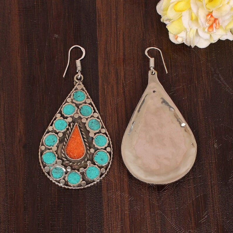 Natural Coral & Blue Turquoise Gemstone Brass Earring