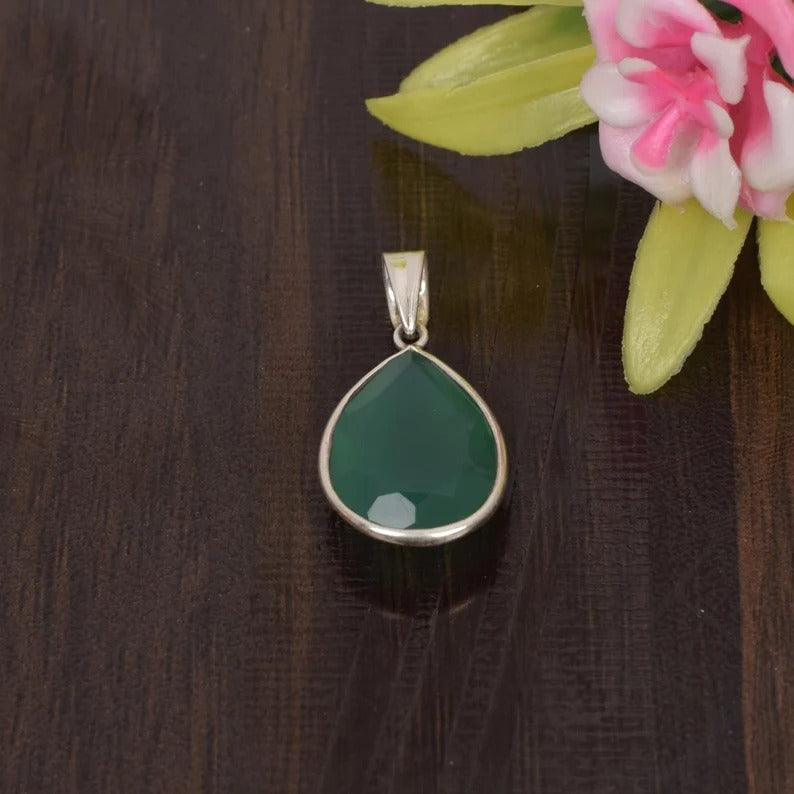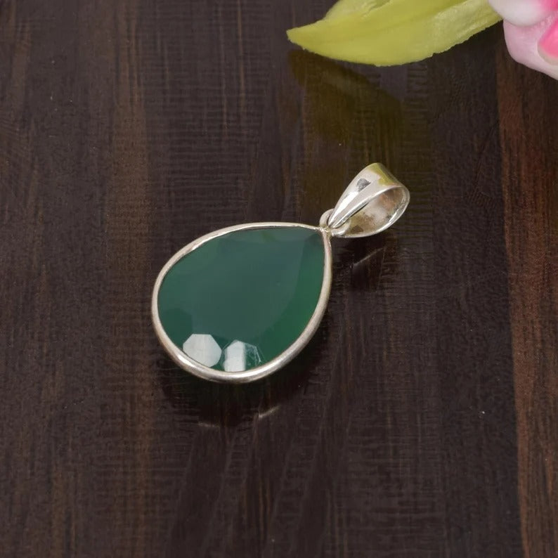 Natural Green Onyx Faceted Pear Stone 92.5 Sterling Silver Pendant