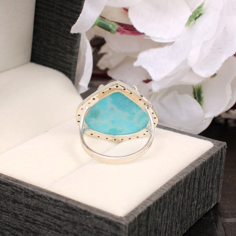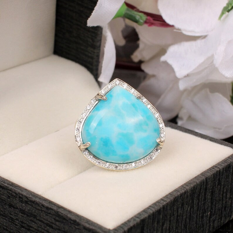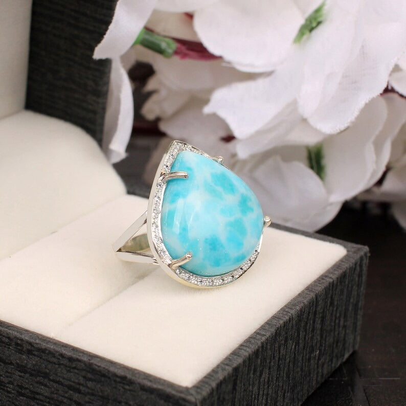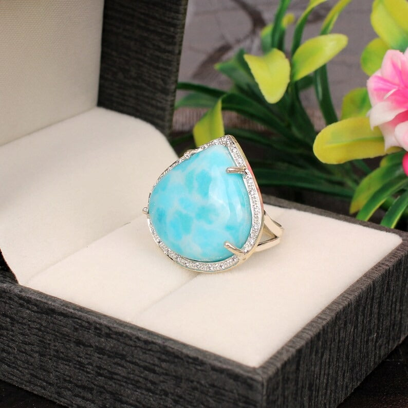 Natural Larimar And Cz Gemstone 92.5 Sterling Silver Ring