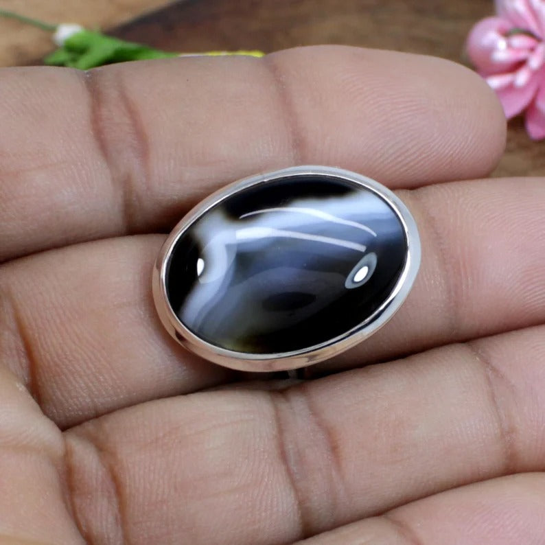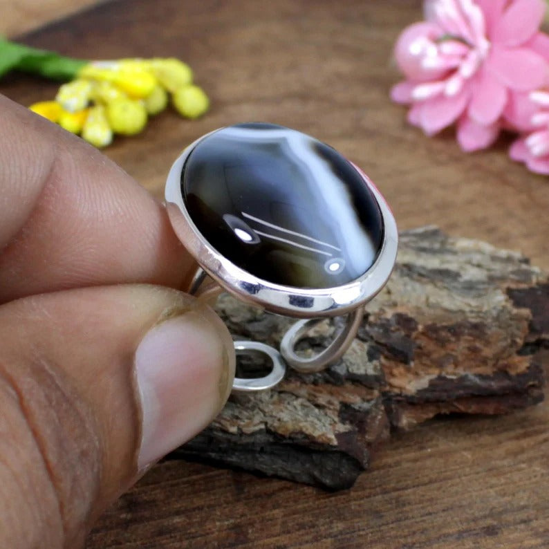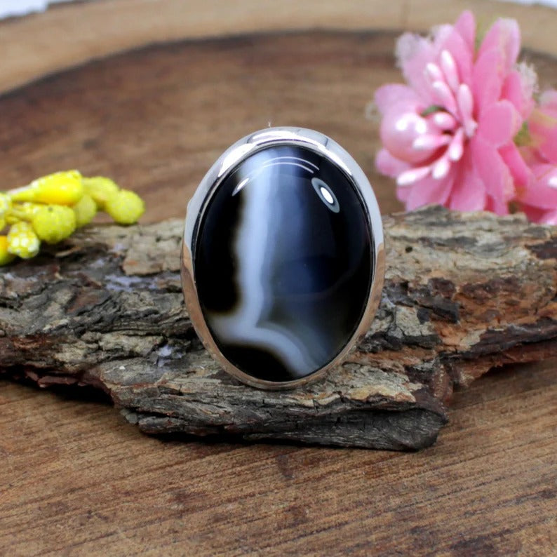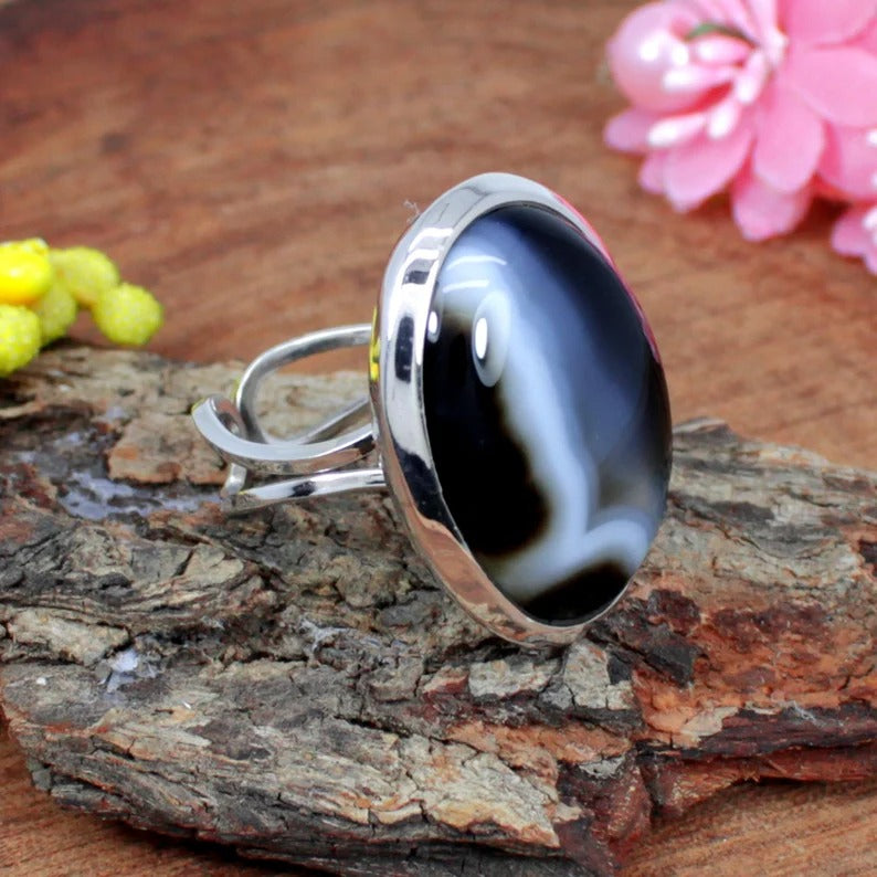 Natural Vintage Style Banded Black Onyx Silver Ring