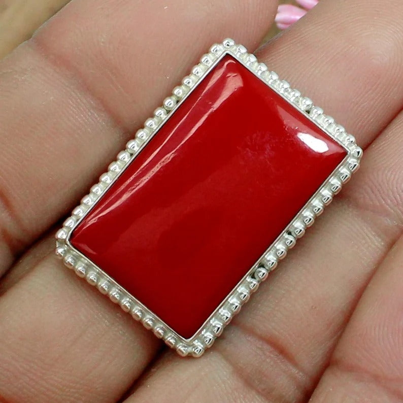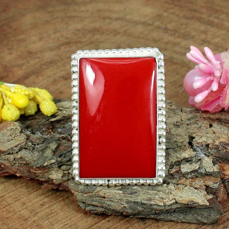 Rectangle Red Coral Bold 925 Sterling Silver Designer Ring