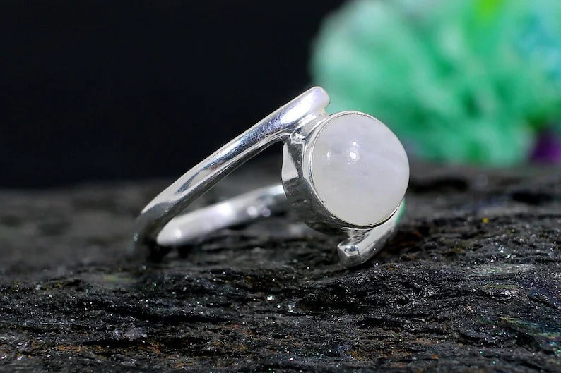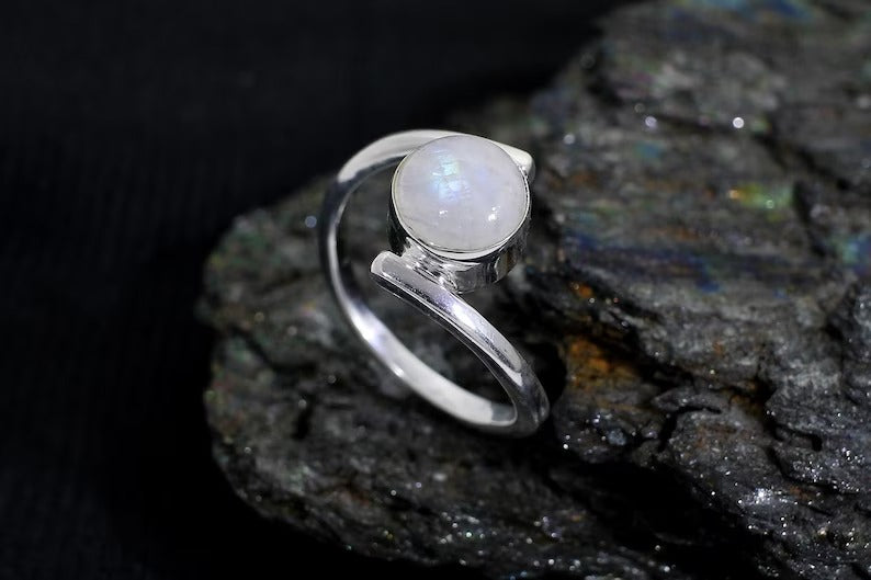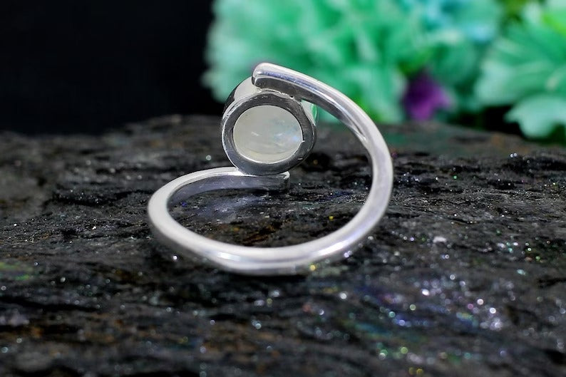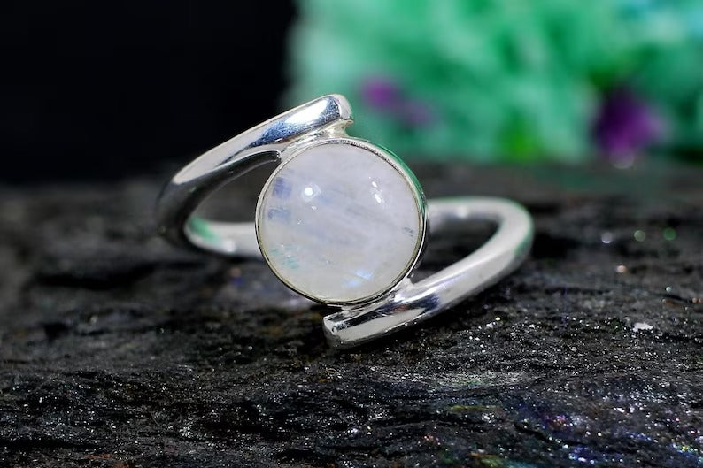 Round Rainbow Moonstone Gemstone Sterling Silver Ring