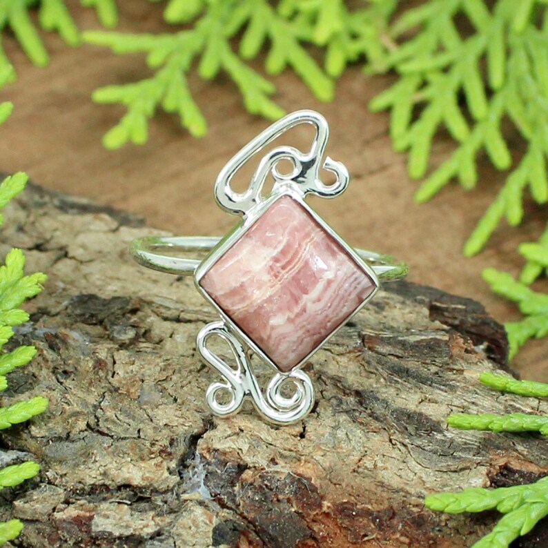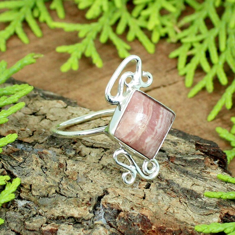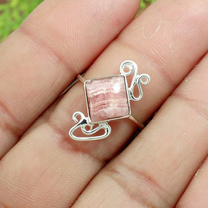 Square Rhodochrosite Gemstone Sterling Silver Ring