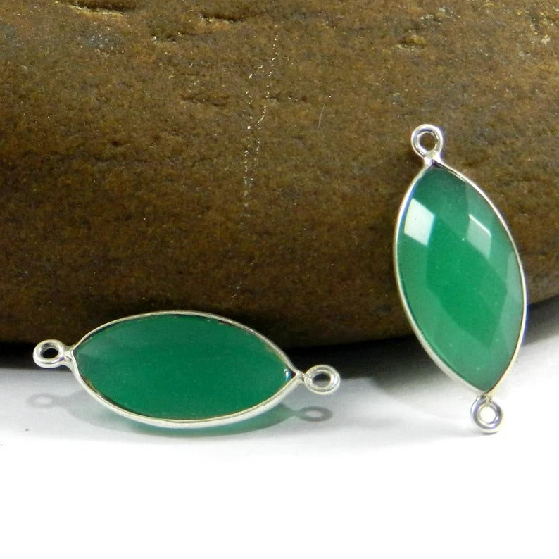 Synthetic chrysoprase marquise rose cut 925 sterling silver 28 x 11 mm double loop bezel set station connector for making jewelry
